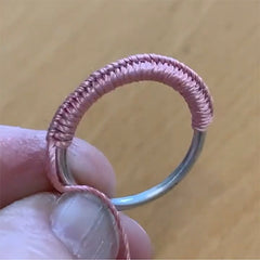While my daughter was in labor and I was watching the baby’s heartbeat, I kept picturing how I was going to knit the ring. I considered few different options and tried a few different ideas, such as using silver wire, wrapping a few ring bands together, weaving wire and thread, until I came up with the solution of using pink silk thread to wrap it around a ring band. I made five 20k gold ring bands and a three in silver. One silver band was wrapped with the pink thread. The rings can be used all together, stacking them up.